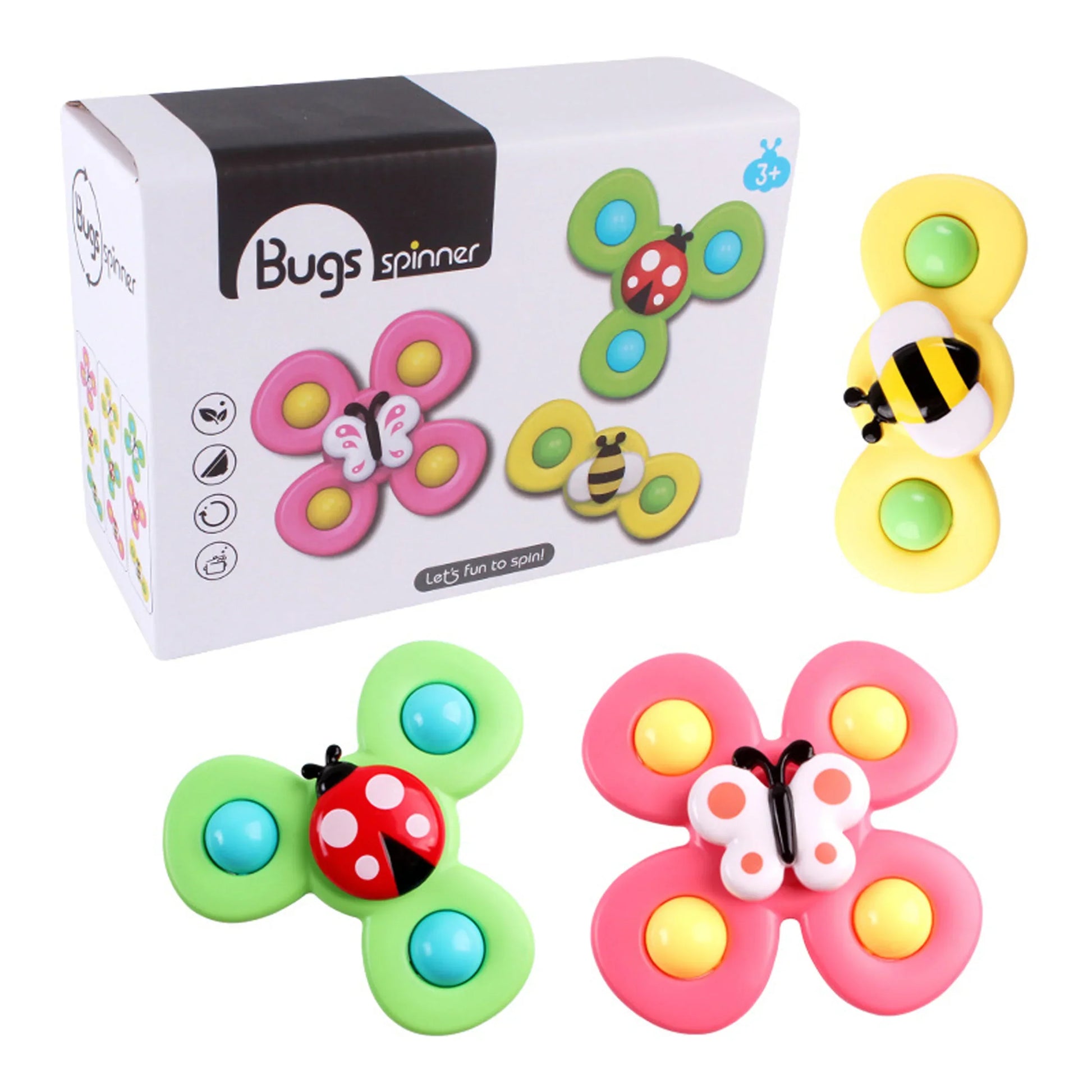 - Suction Cup Spinner Toys: It includes 3pcs cute baby spinner toys with different pattern: butterfly, bee and ladybug, cute and vivid, can attract kids' attentions and share happy time with your babies.