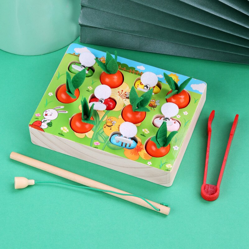 - 2 IN 1 Wooden Toys: Our Montessori toy consisting of carrot harvest and Clip Bee Game. The cute farm land pattern with different colored bees and carrots make them look cute and improve color cognition.